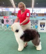 A 15 month old male of good size. Well presented. A good size head, correct bite and nice dark eye. Correct length of neck into well laid shoulders. Coat is changing but the adult coat coming through is of good quality. Correct topline showing the rise over loin. He moves a little close behind which may settle as he grows and improves in muscle tone.