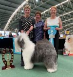 Nearly 4 year old bitch of really lovely type and excellent size. Very pleasing to the eye. Excellent head proportions with correct bite. Good length of neck into well laid shoulders and correct topline. Excellent coat type and presented beautifully. Very happy on the move with the correct gait